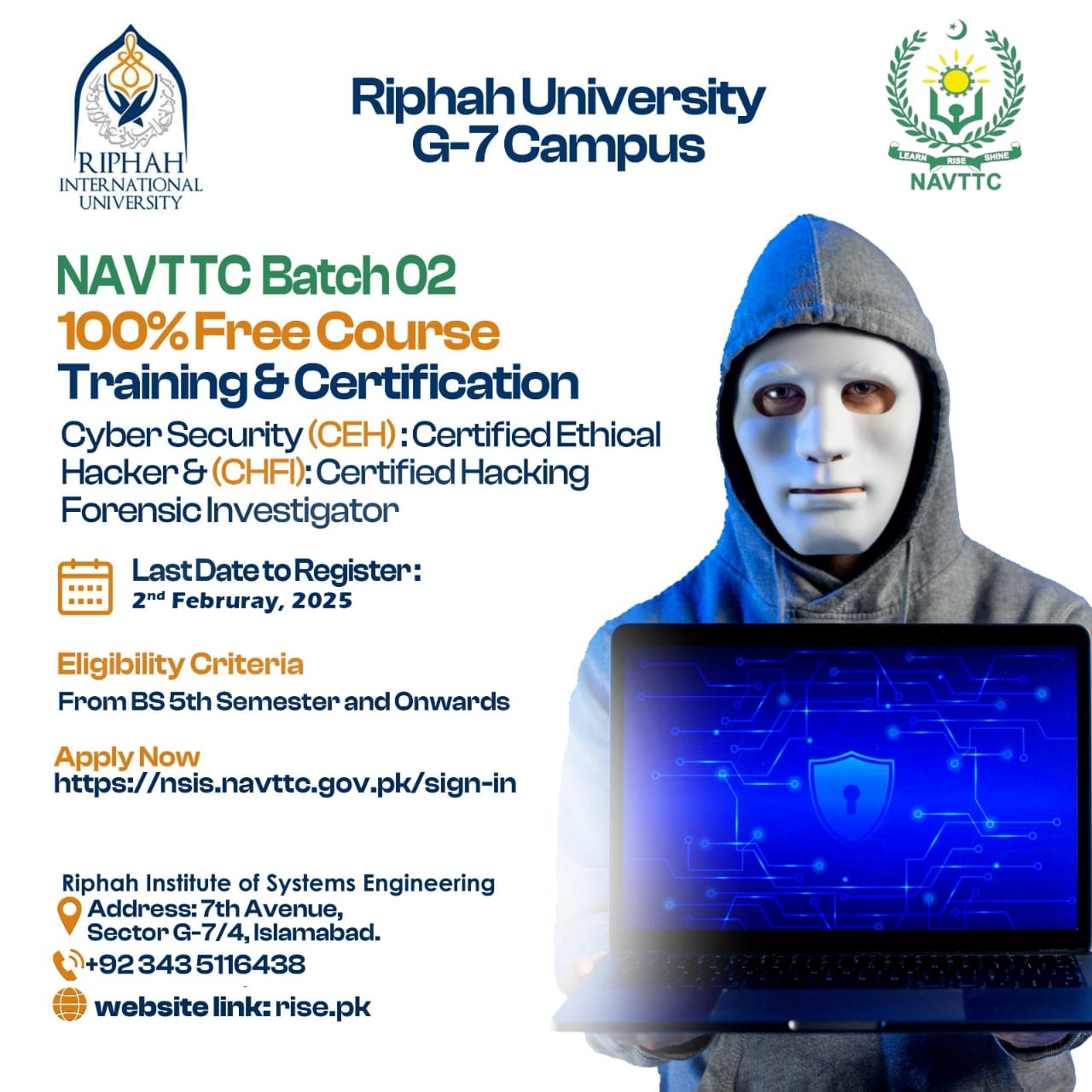 Riphah International University, in collaboration with the National Vocational and Technical Training Commission (NAVTTC), proudly offers free, high-quality training programs to equip individuals with industry-demanded skills and certifications.
